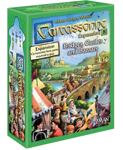 The eighth expansion for Carcassonne, Brücken, Burgen und Basare (English: Bridges, Castles & Bazaars) allows players three new options while playing: