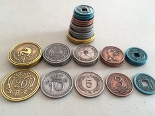 These 80 custom metal coins are designed specifically for Scythe by artist Jakub Rozalski. They include denominations of $1, $3, $5, $10, and $20. Theyβre made of zinc.